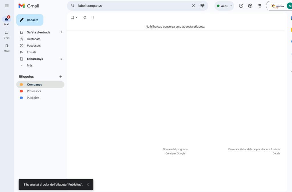 He creat 3 etiquetes una per els correus dels profes la segona per els dels meus companys i l’ultima per temes de publicitat i coses que no m’interesen